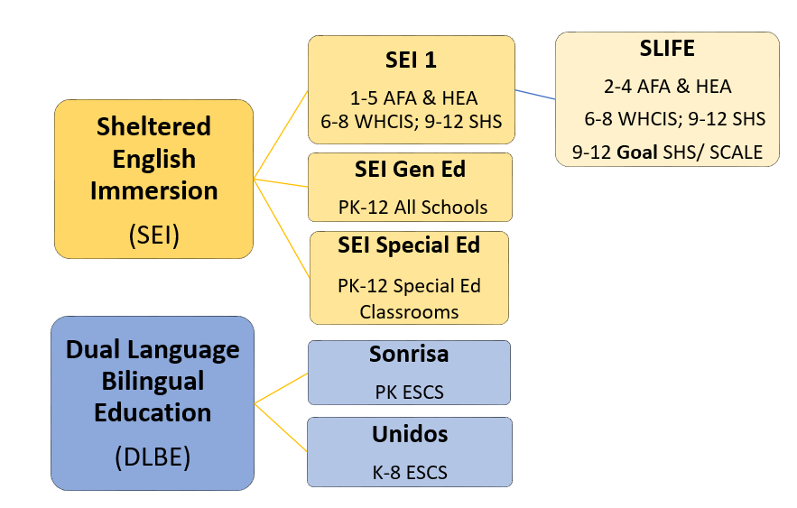 Sheltered English Immersion Program (SEI–1) for immigrant newcomer students at the beginning stages of learning English. The program is designed to meet students’ unique cultural and linguistic needs. This program is temporary and students transition as they progress in their English language development.