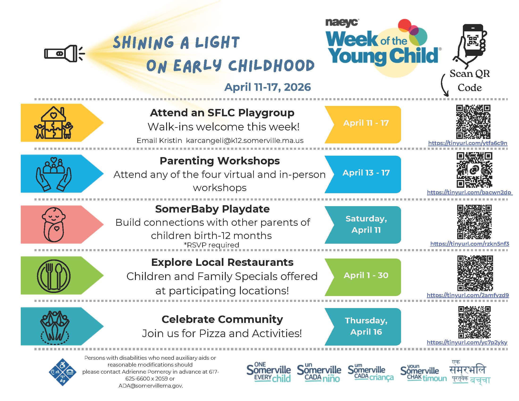 The City of Somerville, the Somerville Public Schools, and Somerville’s early childhood community is hosting a public Week of the Young Child celebratory event under our banner of One Somerville, Every Child. The event honors young children, their families, and teachers while highlighting the critical importance of high-quality early childhood education and developmental needs